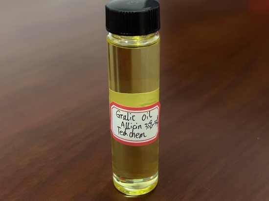 Huile d'ail Allicine 35%~55% CAS NO.8008-99-9 Liquide volatil, de couleur jaune pâle à brun rougeâtre, à forte odeur d'ail. Insoluble dans l'eau, la glycérine et le propylène glycol, il présente une densité relative de 1,050-1,059 et un indice de réfraction de 1,550-1,580. Ses propriétés chimiques sont relativement stables, mais il se décompose facilement en présence d'alcalis. .